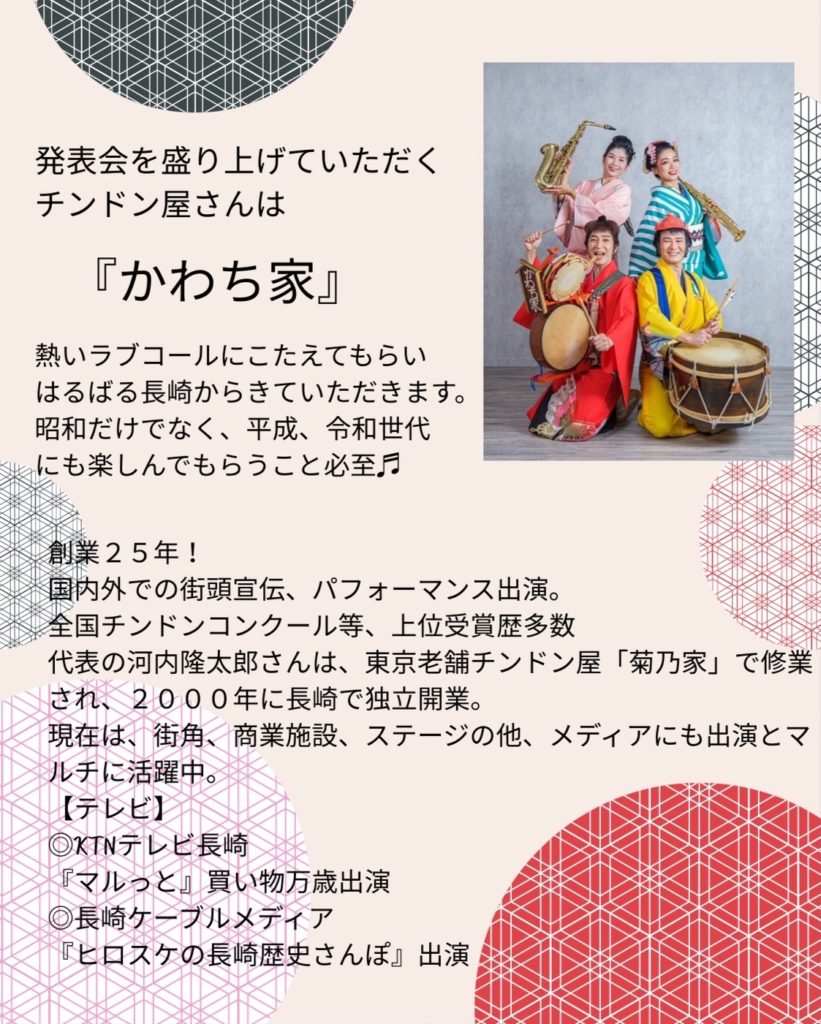 当日は、遠く長崎からチンドン屋「かわち家」さんも会場を盛り上げてくれます。華やかで賑やかなパフォーマンスをどうぞお楽しみに!