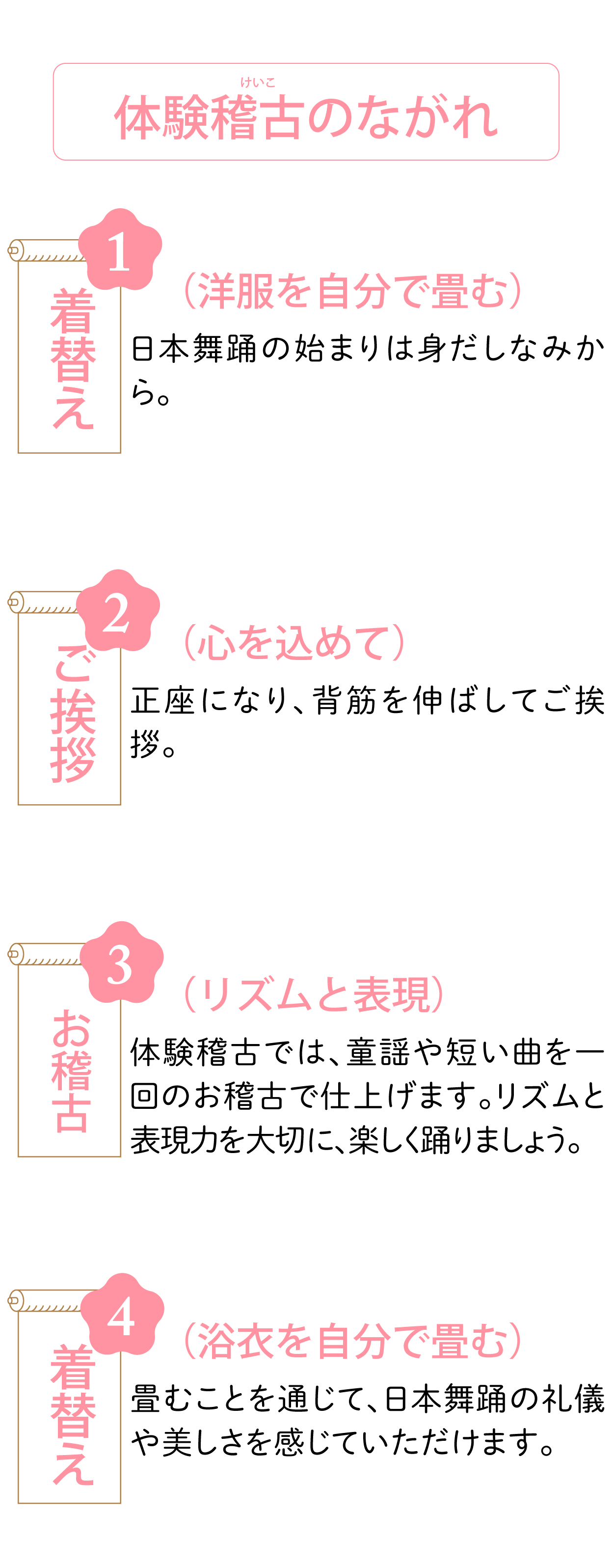 稽古:3回完結(浴衣着付け・3回稽古で1曲仕上げる完結型)